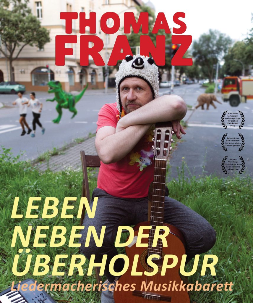 Am liebsten sitzt Franz auf dem Grünstreifen. Doch er ist nicht einfach nur neben der Spur – Thomas Franz ist neben der Überholspur! Seine Themen sind so drängend wie eine Lichthupe, seine Beobachtungen so scharf wie die engste Kurve, seine Einsichten so überraschend wie ein Blitzer. Seine Fragen dagegen sind wie Verkehrskontrollen: sie lassen uns innehalten. Sind wir nicht alle einfach nur Säugetiere? Bringt eine Currywurst schlechtes Karma? Warum steckt das Bienenhotelgewerbe in der Krise? Und was tun, wenn auf einmal Vampire angreifen? Das Ergebnis seiner Exkursionen präsentiert Franz nun in seinem neuen Programm. Es sind Lieder über das Wundern und Phantasieren – direkt gegriffen aus dem Leben neben der Überholspur.